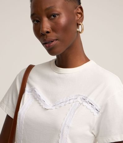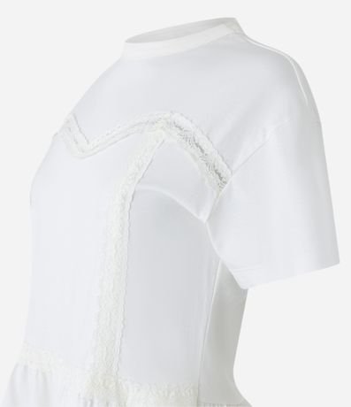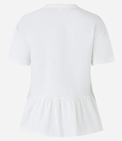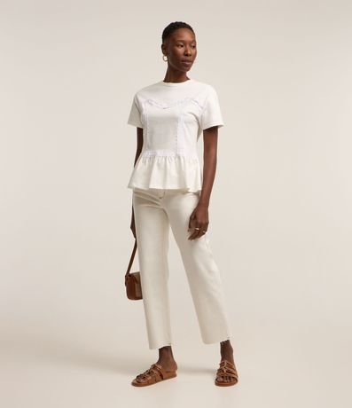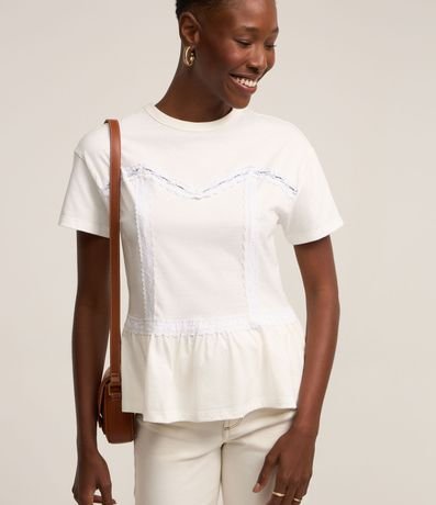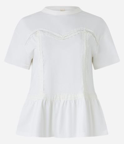 Ref: Blusa feminina, confeccionada em algodão, com gola redonda, mangas curtas, detalhes de renda e babado na barra.