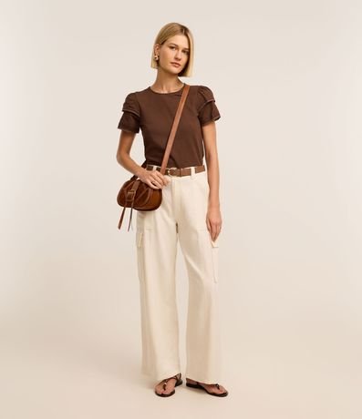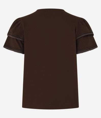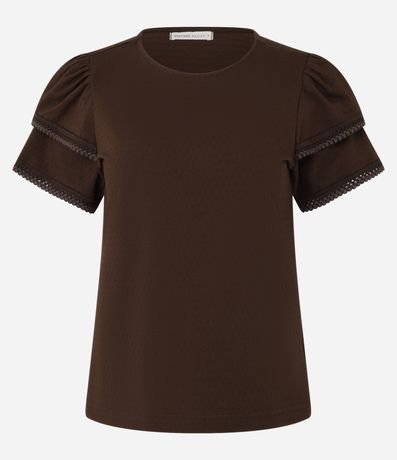 Ref: Blusa de mangas curtas, com gola redonda e detalhes picotados em efeito crochê nas mangas. Confeccionada em algodão mais sustentável.