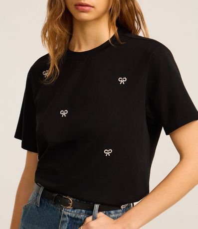Blusa de mangas curtas, confeccionada em algodão, com gola redonda e bordados de lacinhos com pérolas artificiais aplicadas. Este produto possui viscose certificada em sua composição, sendo ambientalmente mais responsável.