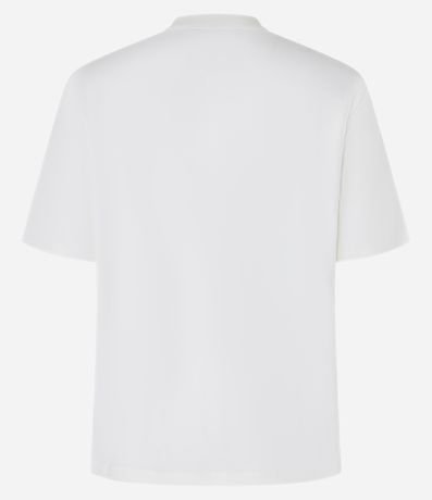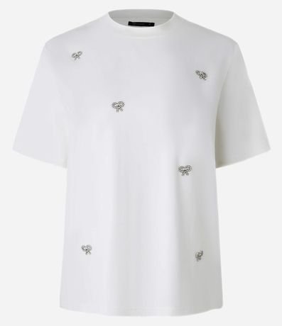 Blusa de mangas curtas, confeccionada em algodão, com gola redonda e bordados de lacinhos com pérolas artificiais aplicadas. Este produto possui viscose certificada em sua composição, sendo ambientalmente mais responsável.