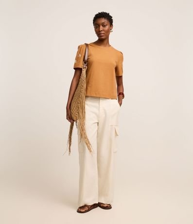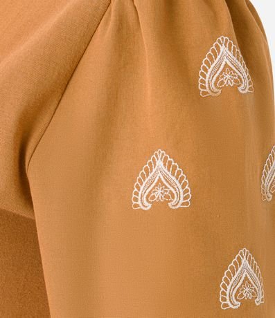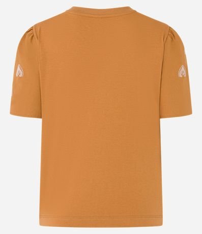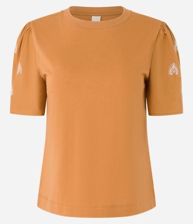 Ref: Blusa de mangas bufantes curtas, confeccionada em algodão, com gola redonda e bordados decorativos em ambas as mangas. Este produto possui algodão certificado BCI em sua composição, além de ter sido produzido através de processos mais sustentáveis, sendo ambientalmente mais responsável.