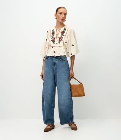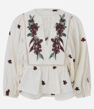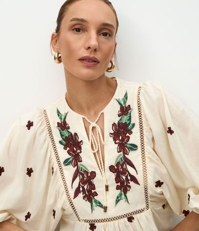 Blusa em Algodão com Bordado Floral e Amarração no Decote