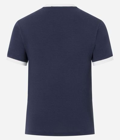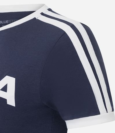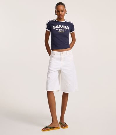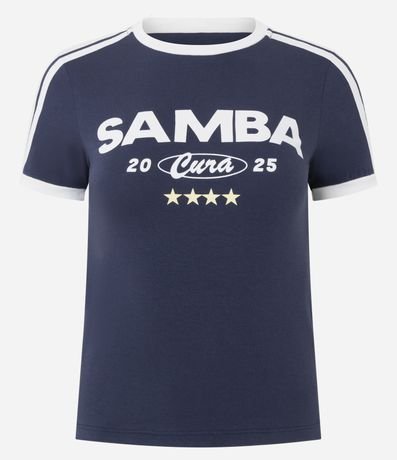 Ref: Blusa new t-shirt de mangas curtas, confeccionada em algodão, com gola redonda e estampa com lettering "Samba Cura". Este produto possui material mais sustentável em sua composição, sendo ambientalmente mais responsável.