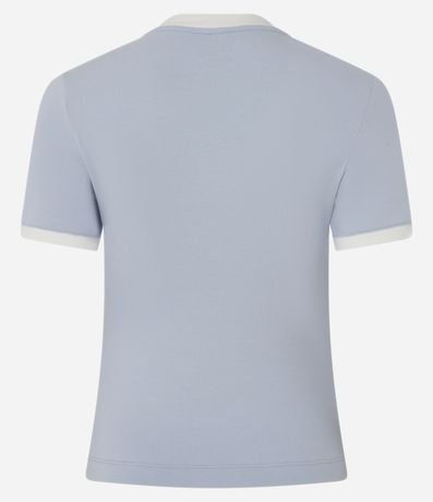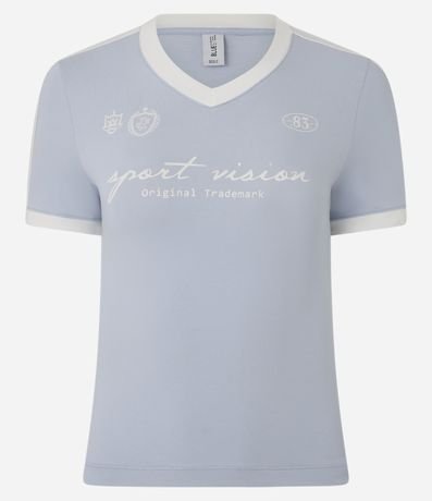 Blusa de mangas curtas, confeccionada em algodão, com gola V contrastante e listras laterais duplas nas mangas. Estampa com lettering de tendência Sportcore e brasões. Este produto possui material mais sustentável em sua composição, sendo ambientalmente mais responsável.