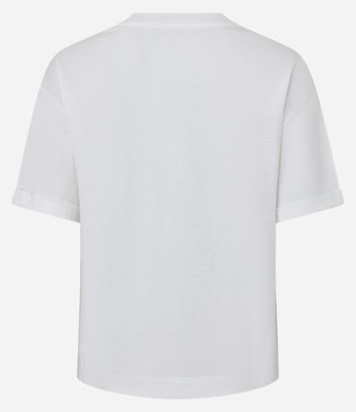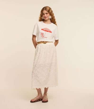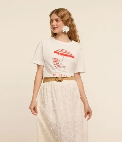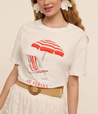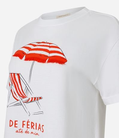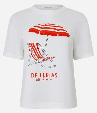 Blusa de mangas curtas com gola redonda e estampa com guarda-sol e cadeira de praia além de lettering "de férias até de mim". Confeccionada em algodão mais sustentável.