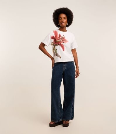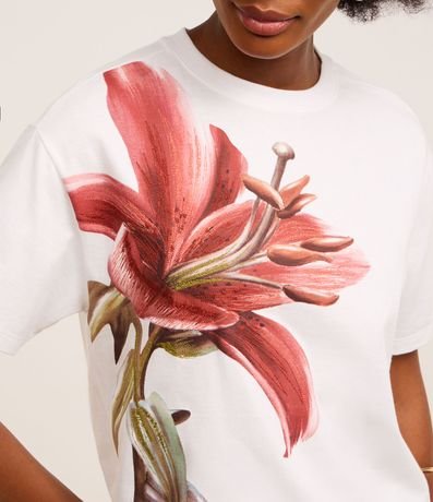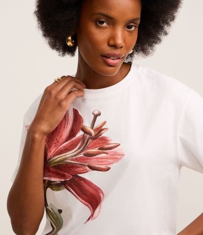 Ref: Blusa de mangas curtas, confeccionada em algodão mais sustentável, com gola redonda. Peça tem estamparia floral com um grande lírio na região frontal.