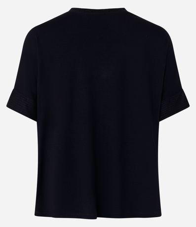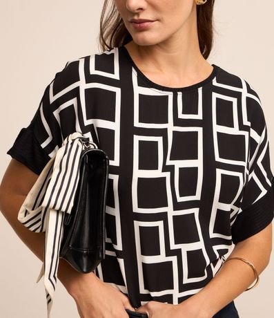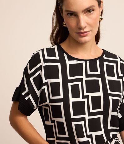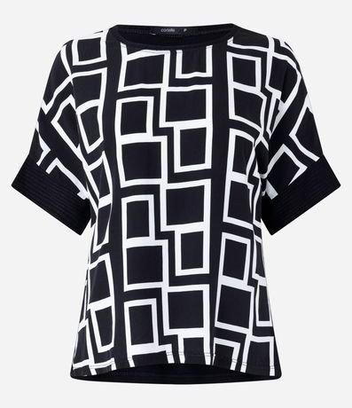 Ref: Blusa confeccionada em algodão, com mangas curtas barradas, gola redonda e estampa frontal geométrica com retângulos irregulares.