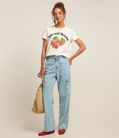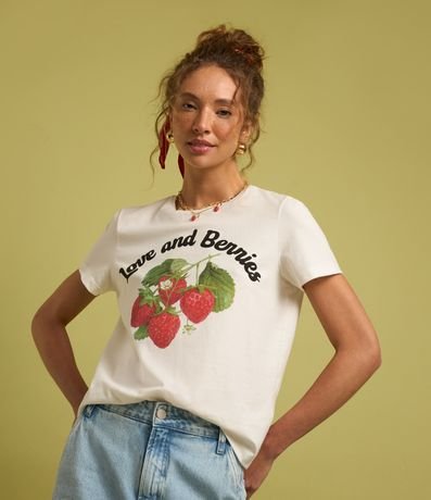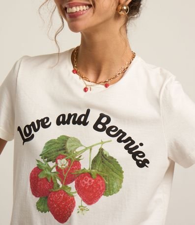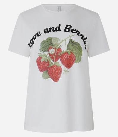 Ref: Blusa manga curta, confeccionada em algodão mais sustentável e estampa frontal em lettering Love and berries e moranguinhos.