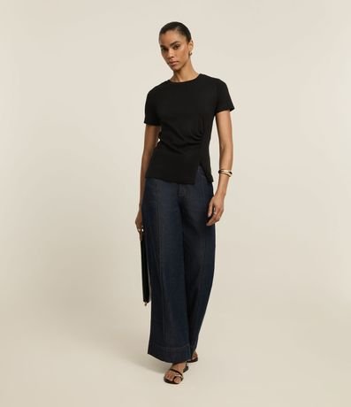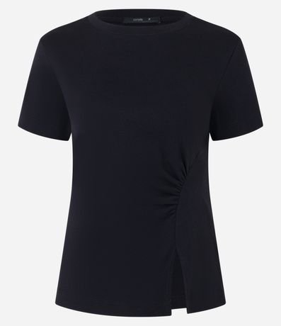 Ref: Blusa de mangas curtas, confeccionada em algodão, com gola redonda e recorte franzido com fenda na barra. Este produto possui algodão certificado BCI em sua composição, além de ter sido produzido através de processos mais sustentáveis com boas práticas ambientais, sendo ambientalmente mais responsável.