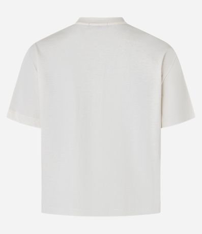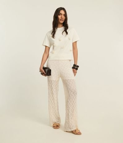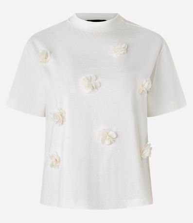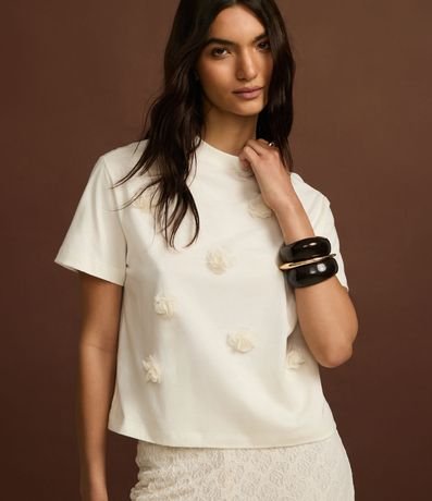 Blusa boxy de mangas curtas, confeccionada em algodão, com gola redonda e aplicações de flores de organza na parte frontal. Este produto possui algodão certificado BCI em sua composição, sendo ambientalmente mais responsável.