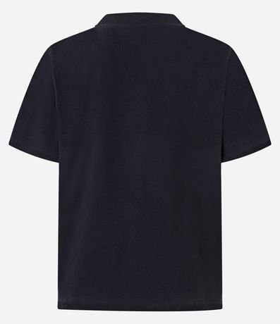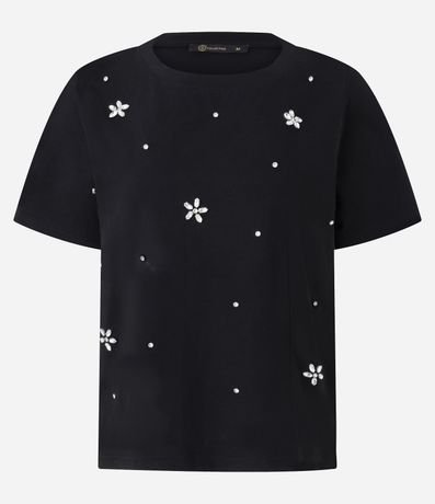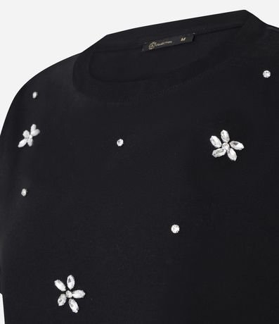 Blusa de mangas curtas, confeccionado em algodão, com gola redonda e flores de pedrarias de strass aplicadas.  Este produto possui algodão certificado em sua composição, sendo ambientalmente mais responsável.