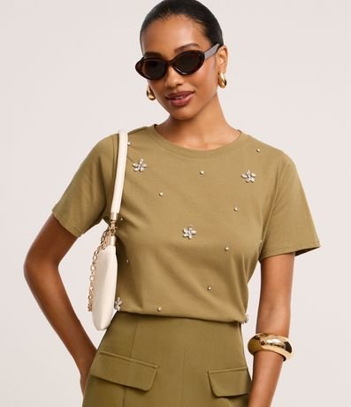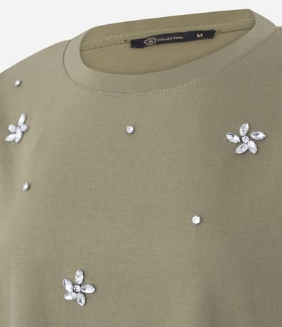 Ref: Blusa de mangas curtas, confeccionado em algodão, com gola redonda e flores de pedrarias de strass aplicadas. Este produto possui algodão certificado em sua composição, sendo ambientalmente mais responsável.