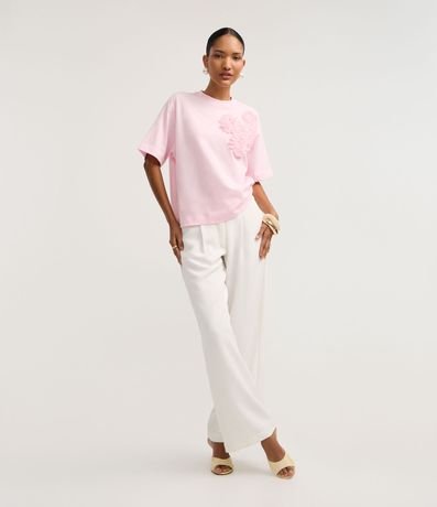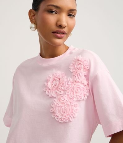 Ref: Blusa boxy de mangas curtas, confeccionada em algodão, com gola redonda e flores de tecido aplicadas na cava. Este produto possui algodão certificado BCI em sua composição, além de ter sido produzido através de processos mais sustentáveis com boas práticas ambientais, sendo ambientalmente mais responsável.