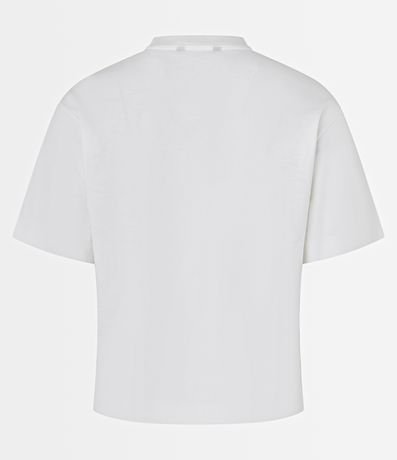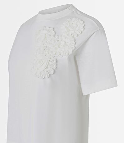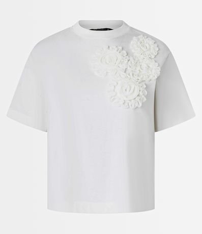 Blusa boxy de mangas curtas, confeccionada em algodão, com gola redonda e flores de tecido aplicadas na cava. Este produto possui algodão certificado BCI em sua composição, além de ter sido produzido através de processos mais sustentáveis com boas práticas ambientais, sendo ambientalmente mais responsável.