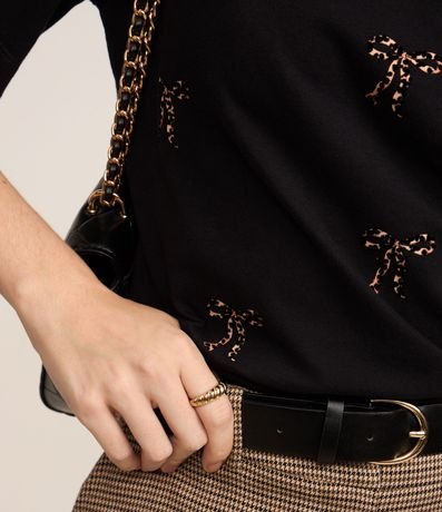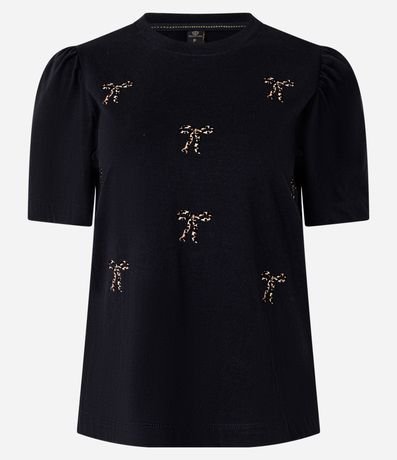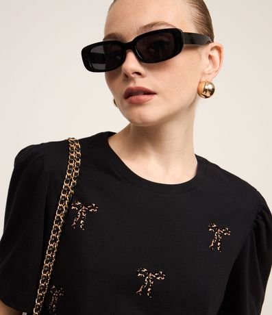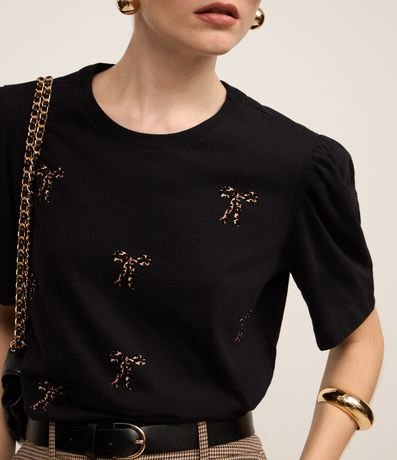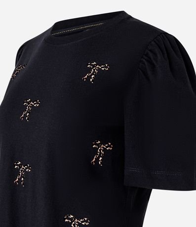 Blusa de mangas curtas bufantes, toda confeccionada em algodão mais sustentável, com gola redonda. Peça tem laçinhos na região frontal com estampa de animal print de onça.