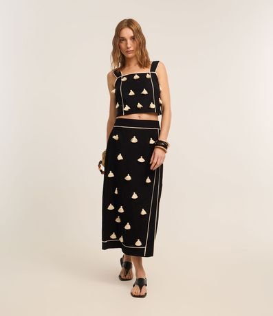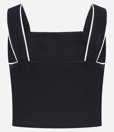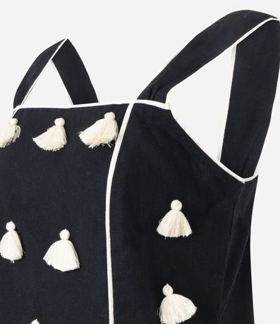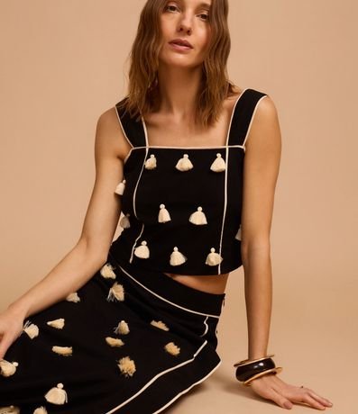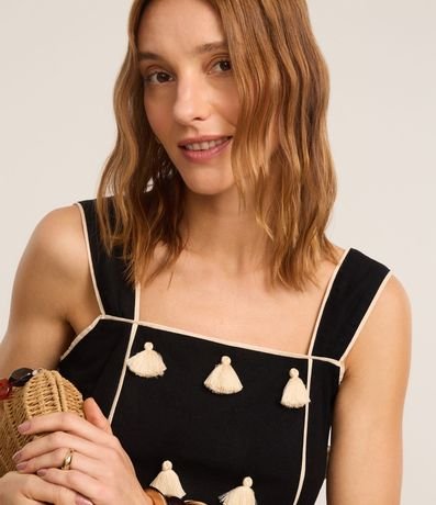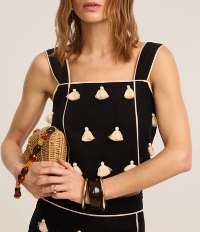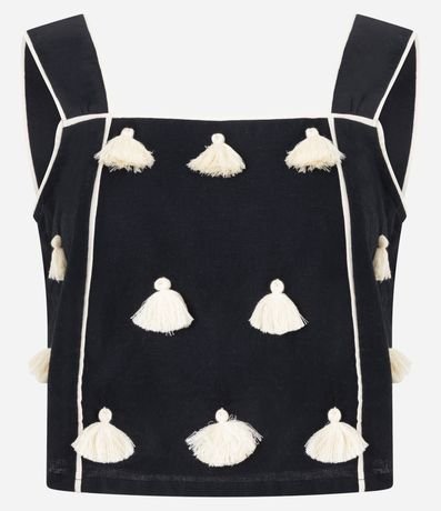 Ref: Blusa curta sem mangas, confeccionada em algodão com 18% de linho, com decote quadrado, vieses contrastantes e tassels aplicados no busto. Este produto possui algodão certificado em sua composição, sendo ambientalmente mais responsável.