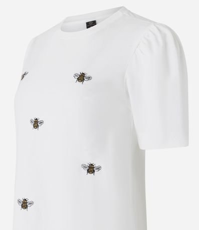 Blusa de mangas bufantes curtas, confeccionada em algodão, com gola redonda e bordados de abelhas.  Este produto possui algodão certificado BCI em sua composição, além de ter sido produzido através de processos mais sustentáveis com boas práticas ambientais, sendo ambientalmente mais responsável.