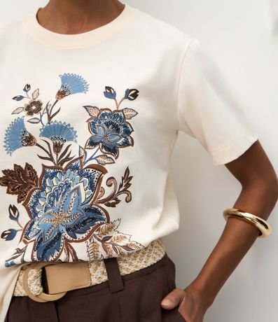 Blusa feminina confeccionada em algodão mais sustentável. Possui estampa floral frontal, gola arredondada, mangas curtas e costas lisas. Ideal para composição de looks casuais para o dia a dia.