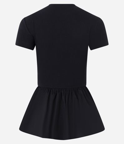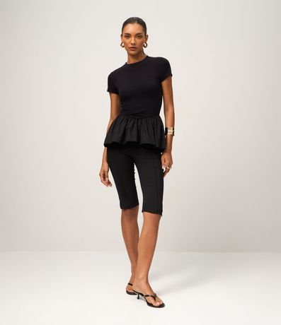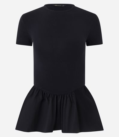 Ref: Blusa feminina confeccionada em algodão certificado, através de boas práticas ambientais. Possui modelo com manga curta, decote redondo e modelagem reta até a cintura. A parte inferior conta com peplum, criando leve volume e movimento.