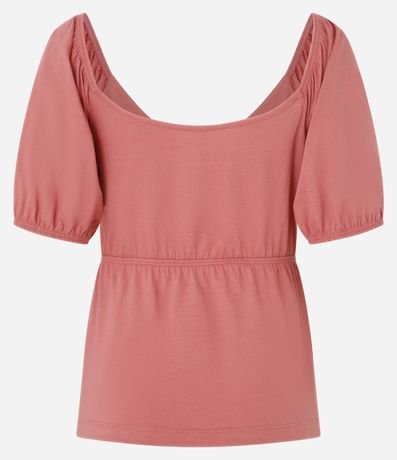 Blusa confeccionada em malha de algodão mais sustentável. A peça tem mangas curtas contrastantes, decote V, amarração no centro do busto e pequena fenda frontal na barra.