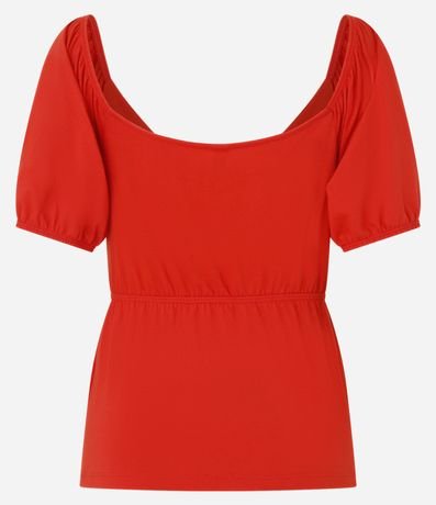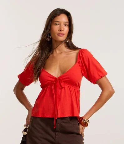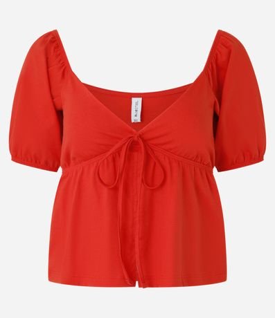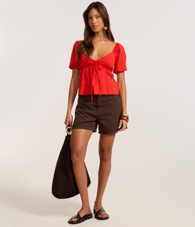Ref: Blusa confeccionada em malha de algodão mais sustentável. A peça tem mangas curtas contrastantes, decote V, amarração no centro do busto e pequena fenda frontal na barra.