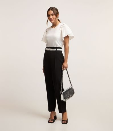 Blusa confeccionada em algodão com gola redonda com mangas curtas bufantes. O glamour desta blusa fica a encargo dos brilhos de strass aplicados nas cavas.
