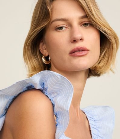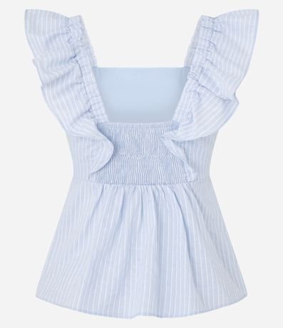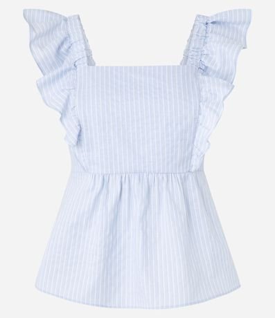 Blusa sem mangas, confeccionada com algodão mais sustentável, com decote quadrado e babados nos ombros. A blusa tem lastex nas costas e listras verticais em fios tintos.