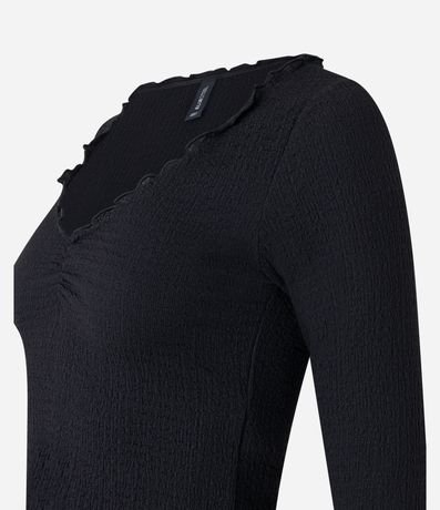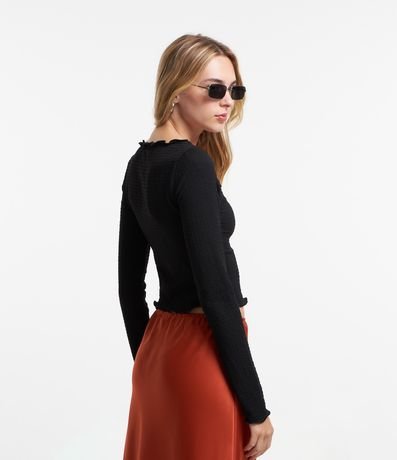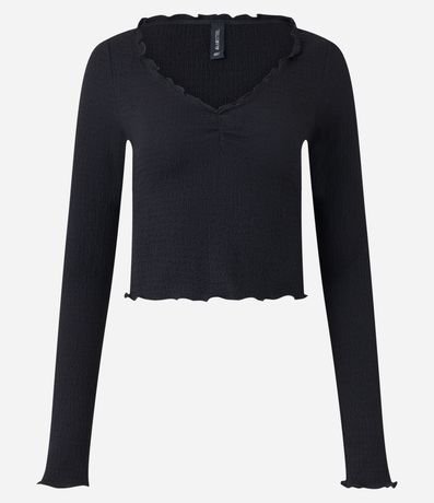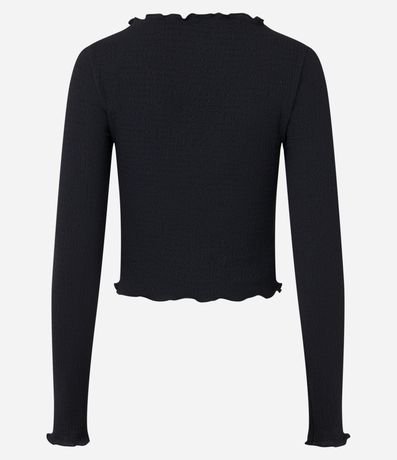 Ref: Blusa manga longa, texturizada, confeccionada em algodão e com detalhe em frufru.