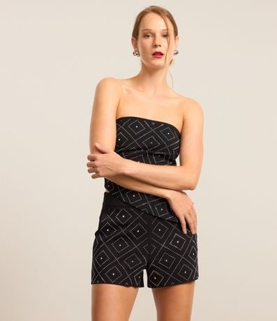 Blusa tomara que caia com brilhos aplicados em formas geométricas, zíper lateral, confeccionada em bengaline e com barra assimétrica alongada.
