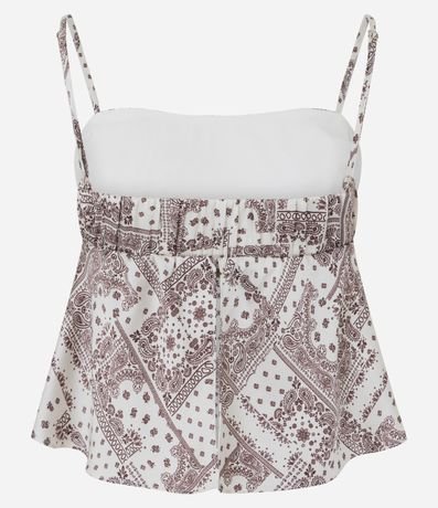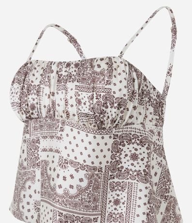 Ref: Blusa feminina em cetim com alças finas, decote coração com leve franzido no busto, estampa abstrata estilo lenço e recorte abaixo do busto.