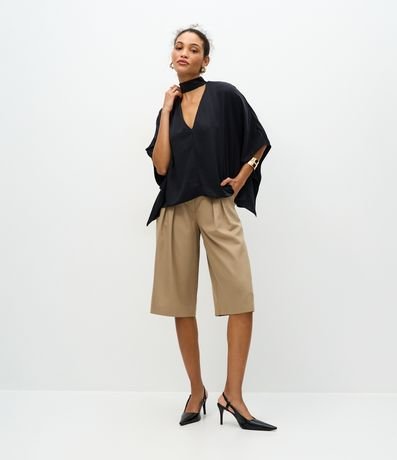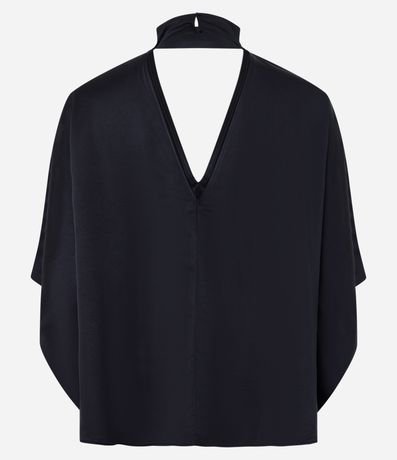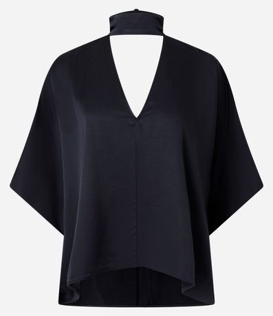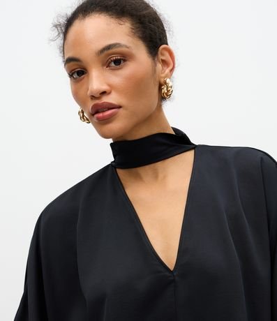Blusa feminina confeccionada em cetim, possui gola alta, decote v, manga curta esvoaçante e sem estampa.