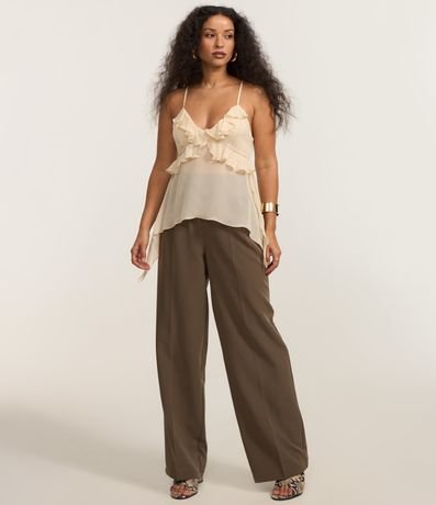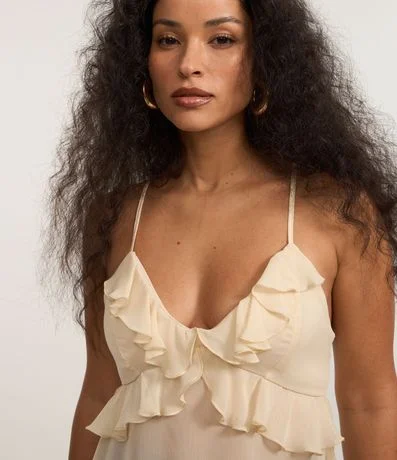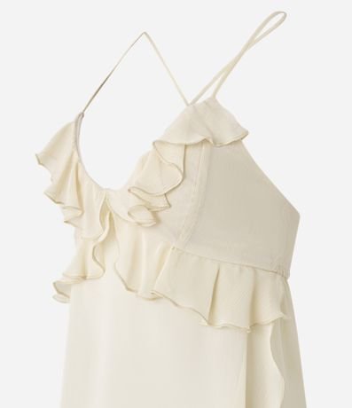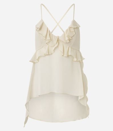 Blusa feminina confeccionada em chiffon, com alças finas e cruzadas nas costas, decote V e detalhe de babadinhos. Possui também barra assimétrica.