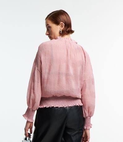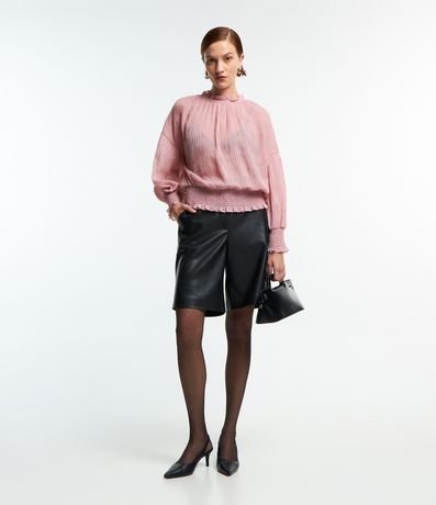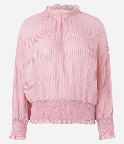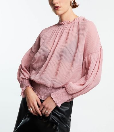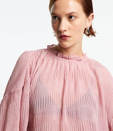 Blusa feminina, confeccionada em chiffon, com golinha frufru, lastex nas barras e textura plissada.