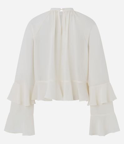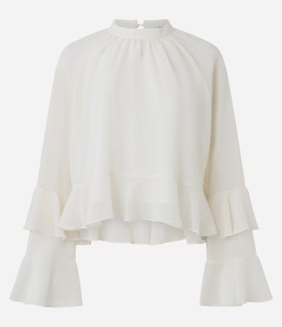 Ref: Blusa feminina em chiffon, com gola alta, mangas longas com babados amplos, formando camadas fluídas e fechamento posterior com botão discreto.