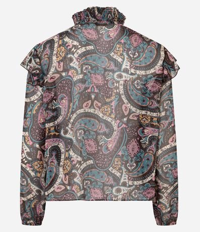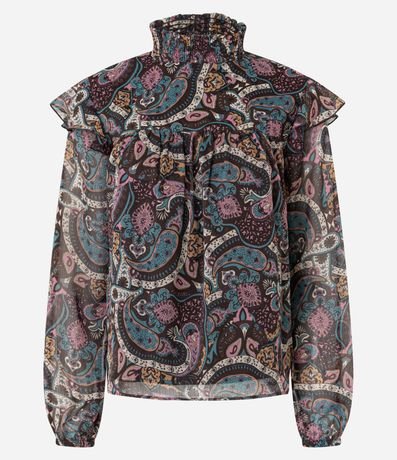 Ref: Blusa de mangas longas, confeccionada em chiffon, com golinha alta, babados nos ombros e estampa paisley com um toque psicodélico. A peça tem caimento leve e soltinho. Este produto foi fabricado através de processos mais sustentáveis, adotando boas práticas ambientais.