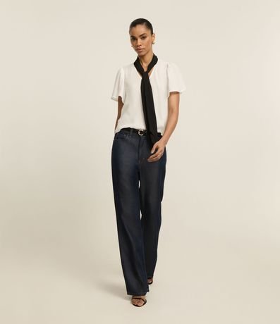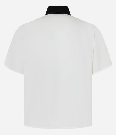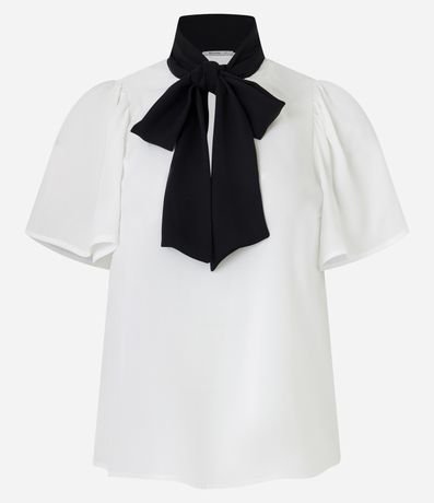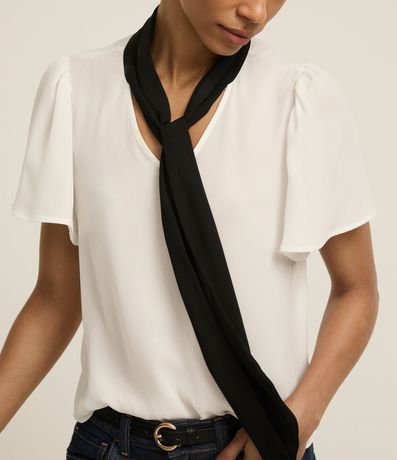 Ref: Blusa feminina confeccionada em chiffon, com gola laço e amarração contrastante, mangas curtas.
