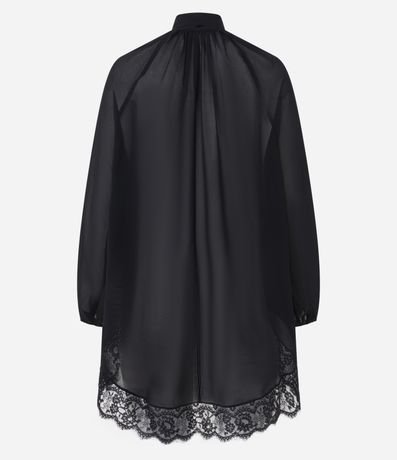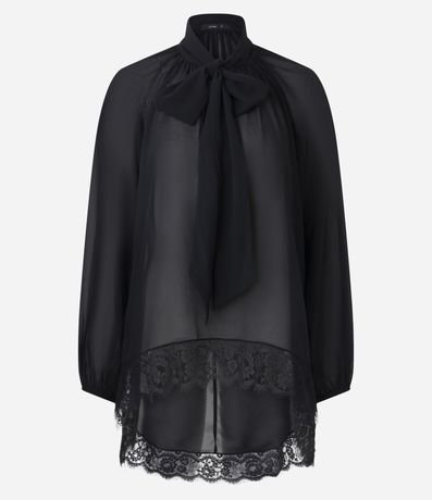 Blusa feminina em chiffon com leve transparência, gola alta com amarração em laço, mangas longas, caimento fluido e barra em renda delicada, acrescentando textura e sofisticação à peça.