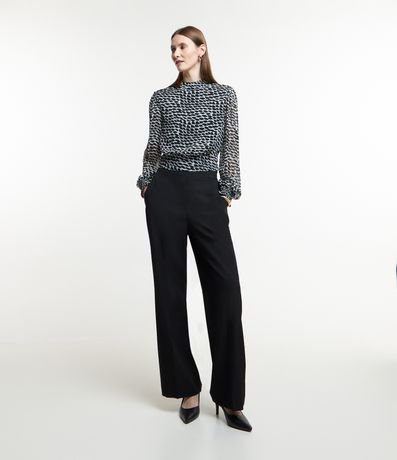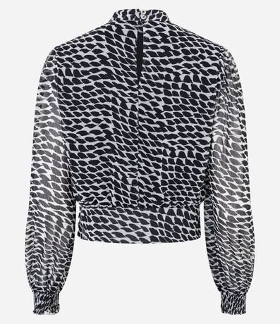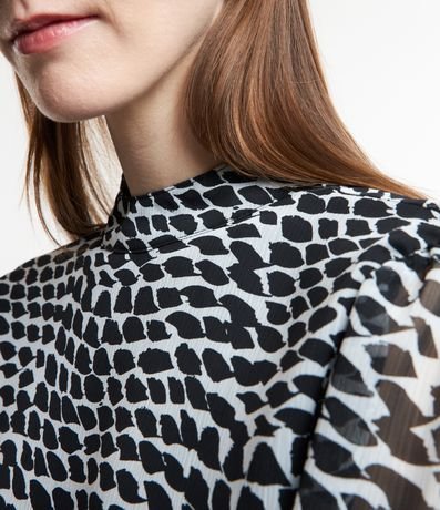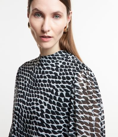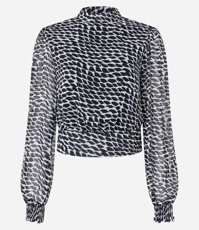 Ref: Blusa feminina, confeccionada em chiffon, com golinha média, mangas longas e lastex nos punhos. A peça também conta com estampa de escamas e com a barra alongada e ajustada.