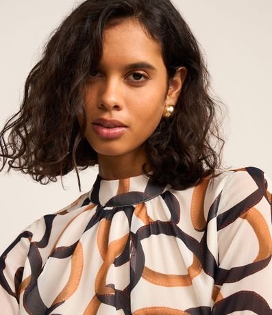 Ref: Blusa de mangas longas de sinos, confeccionada em chiffon, com golinha alta e fechamento por gota. Peça tem estamparia de elos entrelaçados com detalhes de pequenos corações. Produto fabricado através de processo mais sustentável.