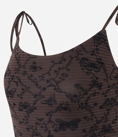 Ref: Blusa feminina sem mangas confeccionado em chiffon. Possui alças ajustadas por amarração, recorte assimétrico e babado aplicado que cria movimento lateral.