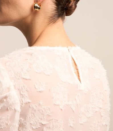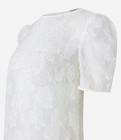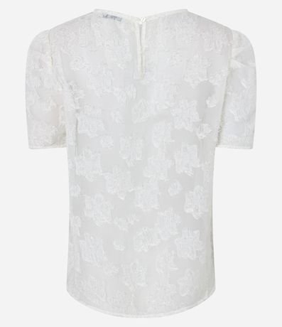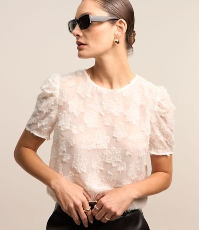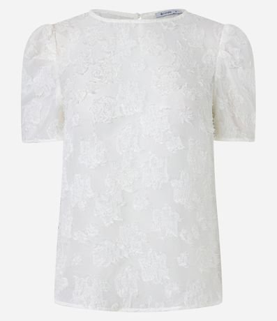 Ref: Blusa feminina, confeccionada em chiffon, com gola redonda, mangas curtas bufantes e texturas.