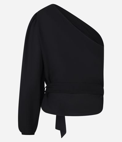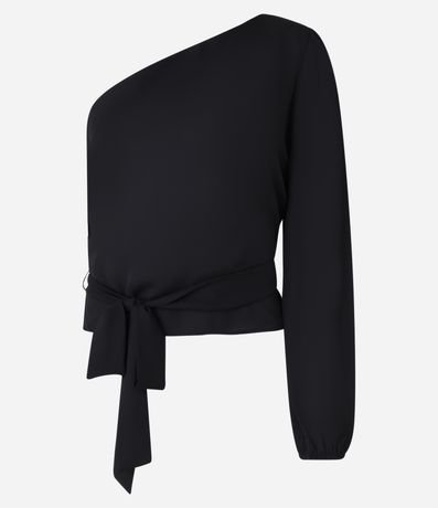 Blusa com decote um ombro só, manga longa, efeito metalizado, confeccionada em chiffon e manga longa.