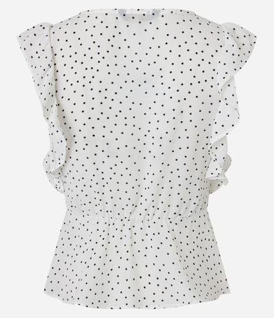 Ref: Blusa sem mangas, confeccionada em crepe através de boas práticas ambientais, com gola e recorte na cintura. Esta roupa tem babados nas cavas além de estamparia de poás - bolinhas - por toda a peça.
