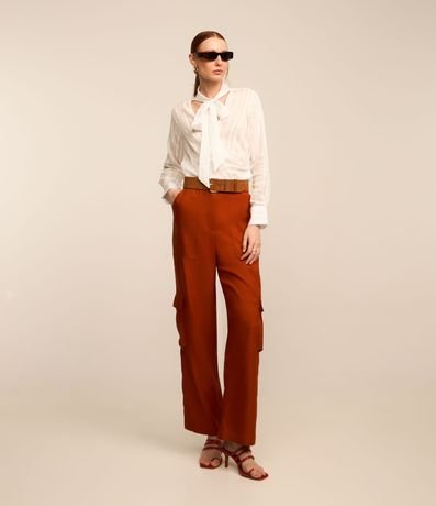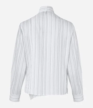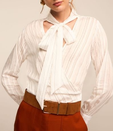 Ref: Blusa feminina, confeccionada em crepe, com amarração na gola, mangas longas e estampa listrada.