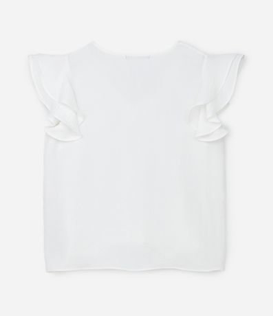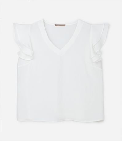 Ref: Blusa sem mangas com babados nas cavas, confeccionado em crepe com decote V. Os babados nas cavas possuem efeito airflow que confere uma espécie de aspecto amassado ao detalhe.