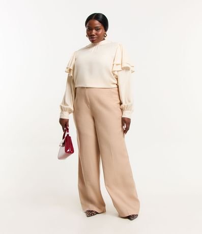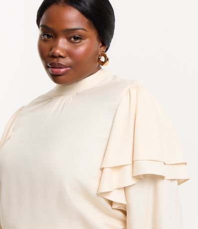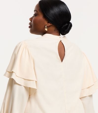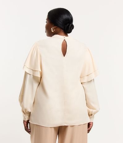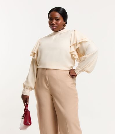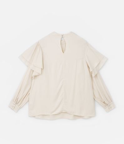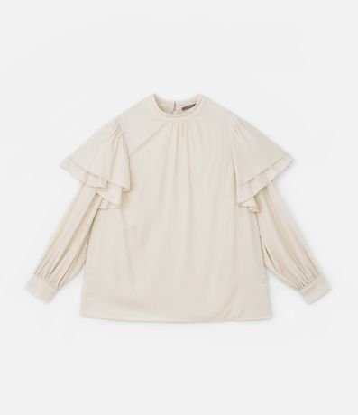Ref: Blusa confeccionada em crepe de viscose, com gola redonda, mangas longas, babados duplos nos ombros. Peça com punhos ajustados e botões forrados.