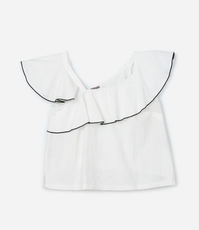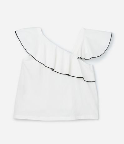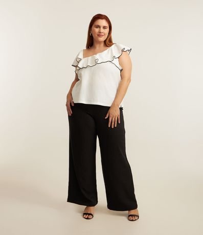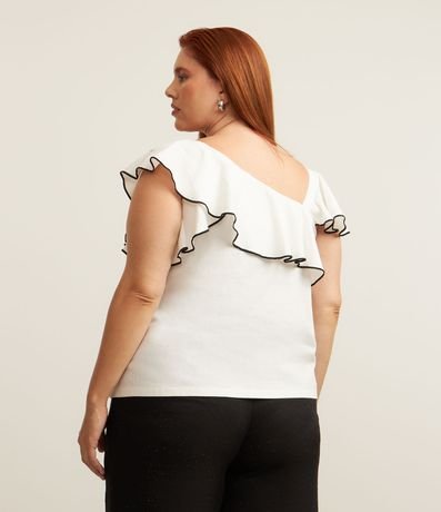Ref: Blusa feminina Curve & Plus Size confeccionada em crepe de algodão mais sustentável com decote assimétrico, babados e detalhe contrastante de costura com textura.