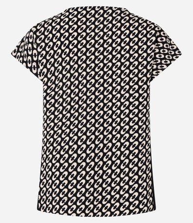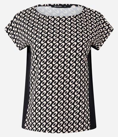 Blusa de mangas curtas confeccionada em crepe com gola redonda. Conta com laterais contrastantes e estamparia geométrica.