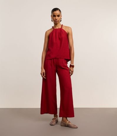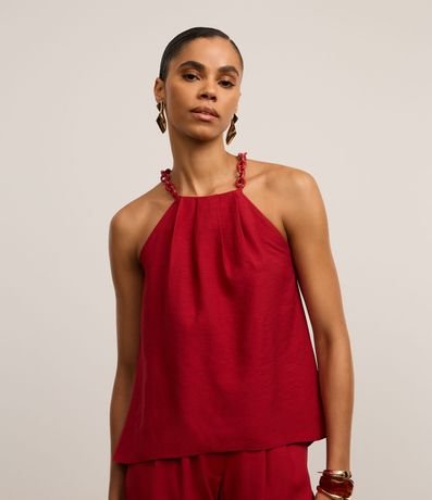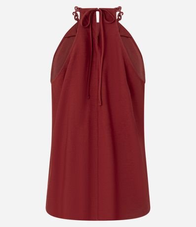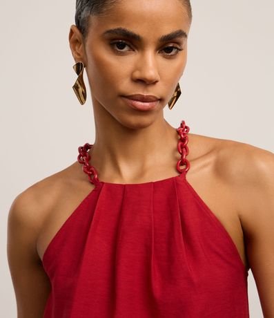Ref: Blusa sem mangas, confeccionada em crepe, com gola halter com corrente e amarração no pescoço. Pela tem malha texturizada. Este produto possui viscose certificada em sua composição, além de ter sido produzido através de processos mais sustentáveis com boas práticas ambientais, sendo ambientalmente mais responsável.