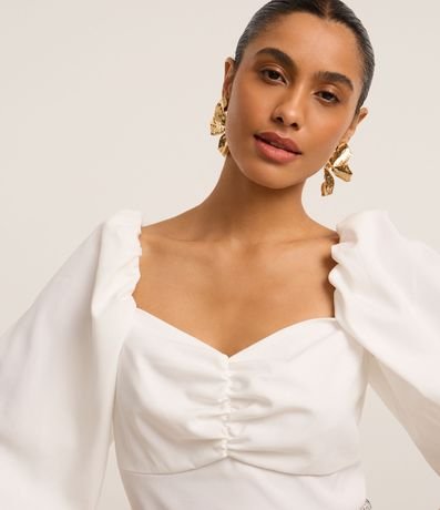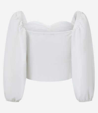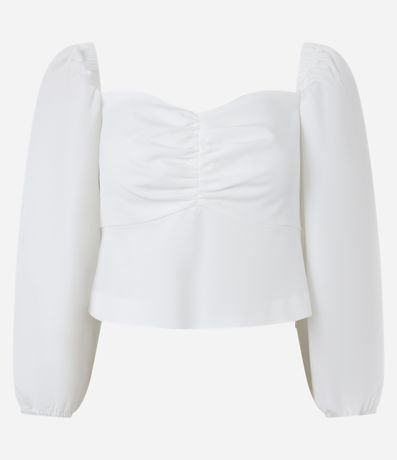Blusa de mangas bufantes longas, confeccionada em crepe, com decote coração. A peça tem franzido no busto e elásticos nas cavas.